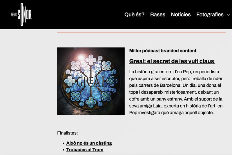 Además, Greal ha sido nominado a los premios Ondas del podcast como mejor branded y mejor podcast de Ficción y a los Ambies como mejor podcast narrativo en español