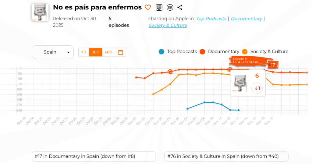 Con tan solo 4 episodios se ha logrado situar en los primeros puestos de podcasts Documentales y entre los 20 primeros en Sociedad y Cultura, una de las categorías mas competitivas de los rankings de Apple Podcasts.